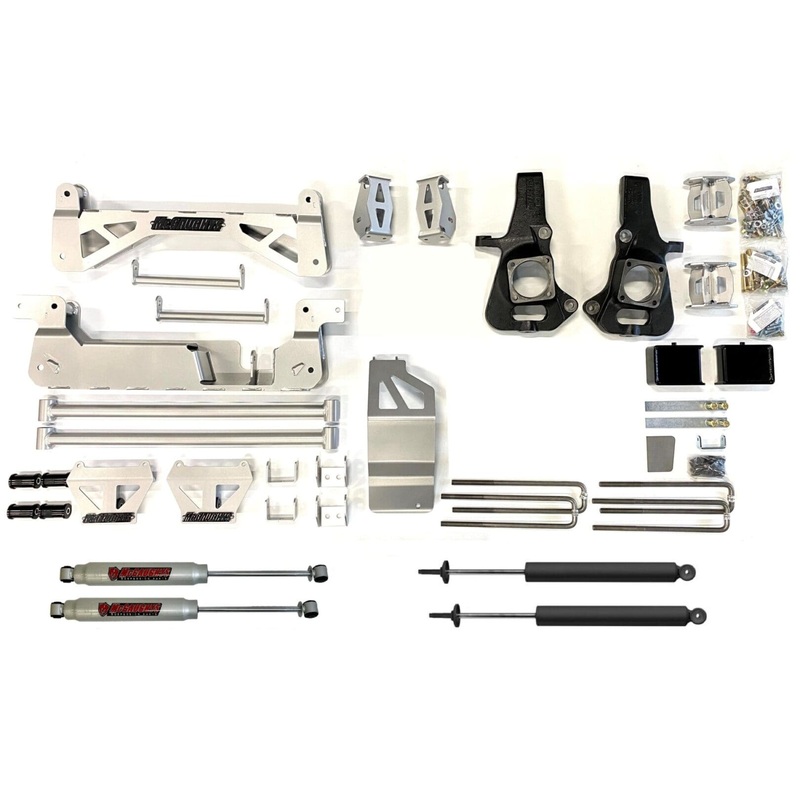 Kit Includes:(2) Spindles, (1) Front Crossmember, (1) Rear Crossmember, (2) Compression Struts, (1) Skid Plate, (2) Rear Bump Stop Extenders, (2) Front Bump Stop Extenders, (2) Torsion Bar Drop Brackets, (4) Compression Strut Brackets, (2) Lift Blocks w/ U
